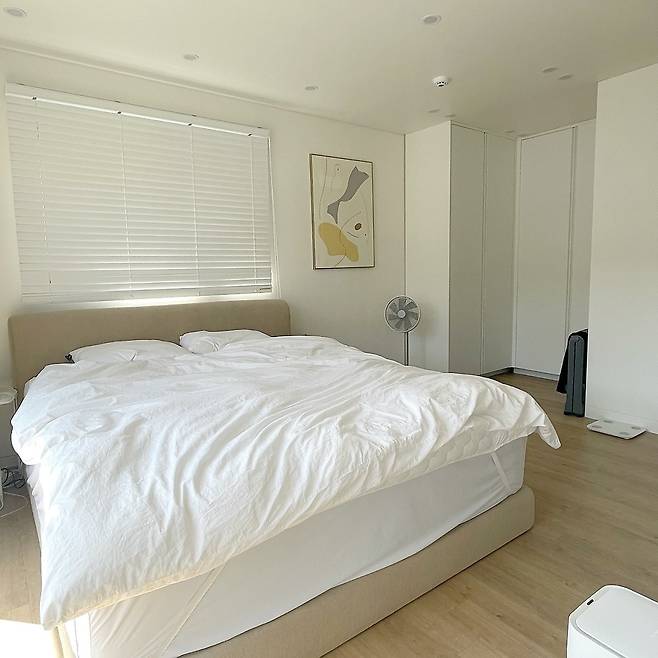 침실로 들어가면 포근함을 중심으로 한 공간 철학이 느껴진다. 문 대신 가벽과 파티션으로 구획한 이 공간은 높은 채광과 초점 있는 가구 배치로 안정감을 준다. 패브릭 베드와 어두운 우드톤의 소품은 따뜻함을 더하며, 베이지 톤의 추상화는 작은 사치처럼 공간을 품위 있게 만든다.