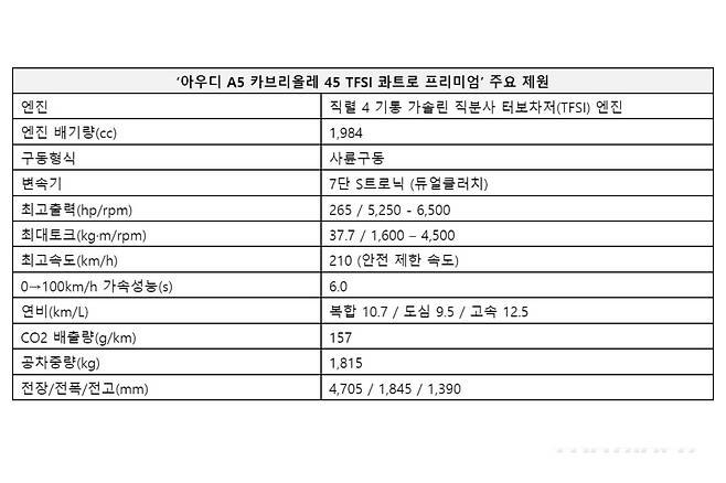 2024년형 A5 카브리올레 45 TFSI 콰트로 프리미엄은 2.0리터 4기통 가솔린 터보 엔진과 7단 S트로닉 변속기가 조합돼 최고출력 265마력, 최대토크 37.7kgm를 발휘한다. 정지상태에서 100km/h 가속까지 6초다. 사륜구동이다. 복합연비는 10.7km/ℓ(도심 9.5, 고속 12.5)다.