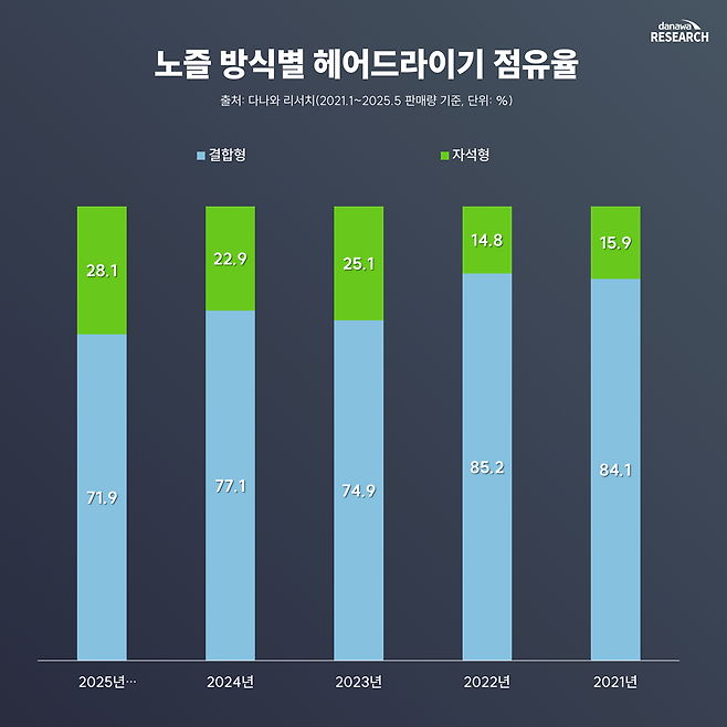 편리함을 중시하는 소비자 인식이 강해지고 있다. 2025년 1~5월 기준 자석형 노즐 드라이기의 점유율은 28.1%로, 2021년(15.9%) 대비 두 배 가까이 증가했다. 노즐을 끼우고 빼는 번거로움 없이 간편하게 탈착되는 자석형 구조가 소비자의 마음을 사로잡은 것이다. 이제 소비자는 단순히 ‘바람이 세고 잘 마르는 제품’보다 ‘사용이 편리한 제품’을 선호한다. 과거에는 "노즐을 그냥 끼우면 되지"라고 생각했다면, 지금은 "왜 굳이 힘줘서 끼워야 하지?"로 변화한 셈이다.