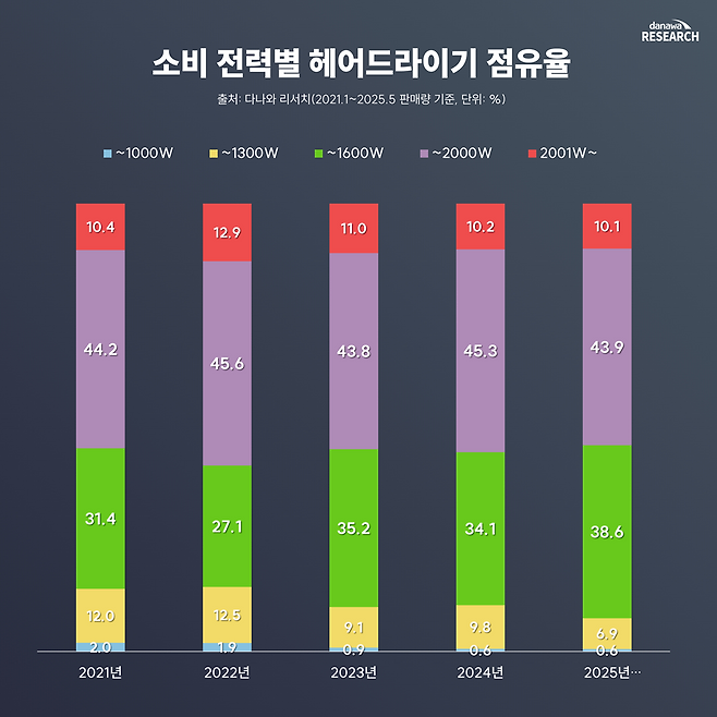 소비전력 기준으로 보면, 1600W 안팎의 제품이 38.6%를 차지하며 주류로 자리 잡았다. 반면, 1300W 이하의 저전력 제품은 7.5%로 떨어져 소비자의 외면을 받고 있다. 흥미로운 점은 강력한 바람으로 유명한 다이슨 슈퍼소닉조차 소비전력이 1600W라는 사실이다.