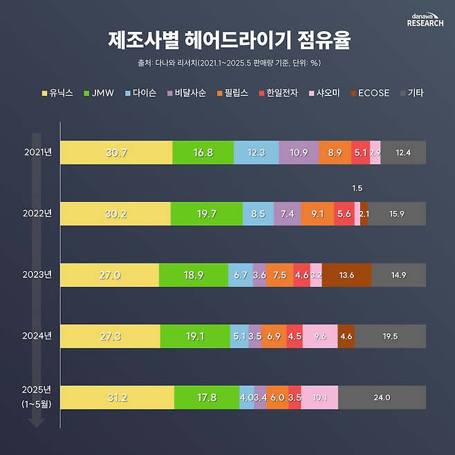 유닉스는 5년 연속 선두다. 높은 브랜드 인지도는 물론, 가성비부터 고성능 제품까지 다양한 제품을 선보이면서 점유율 1위(31.2%)를 차지했다. 전문가용·고출력 제품군으로 유명한 JMW는 점유율이 소폭 하락했으나 17.8%로 2위를 유지하고 있다. 최근 주목할 브랜드는 샤오미다. 대부분 해외구매 제품이지만, 가격 대비 뛰어난 성능으로 2024년부터 급격히 성장해 현재 10.1% 점유율로 3위에 올라섰다.