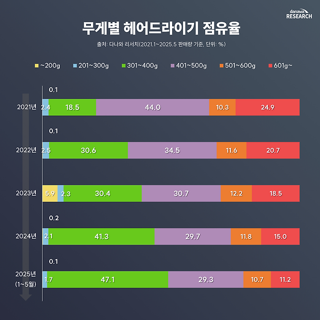 이러한 변화는 다나와 리서치의 데이터에서도 명확히 나타난다. 2021년부터 최근까지 누적 데이터를 보면, 301~400g 제품이 47.1%의 점유율을 기록하며 시장의 표준으로 자리 잡았다. 반대로 401~500g 제품은 지속적으로 줄어들고 있으며, 600g 이상 무거운 제품의 점유율은 급격히 하락하고 있다.