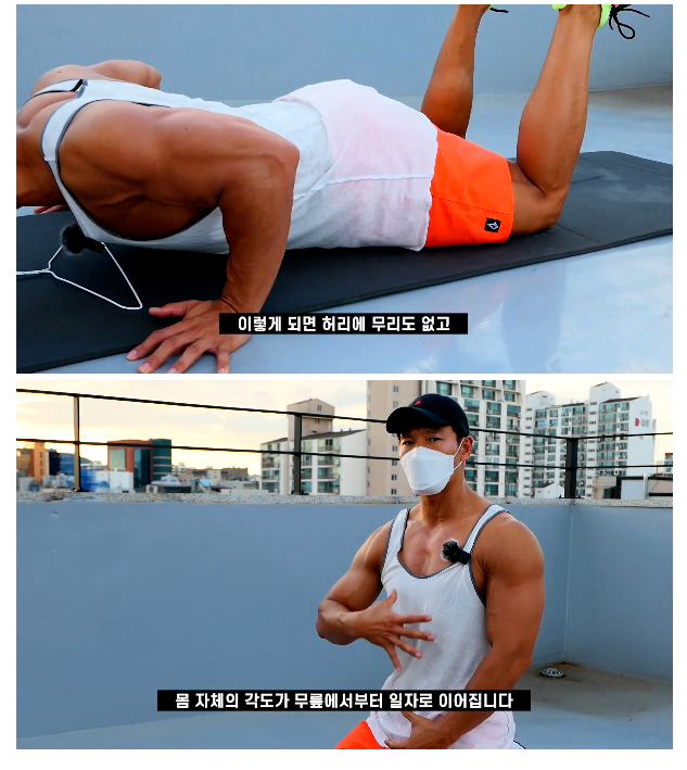 발끝을 모으고, 몸은 일직선 유지 (엉덩이 들리거나 쳐지면 안 됨)