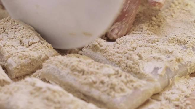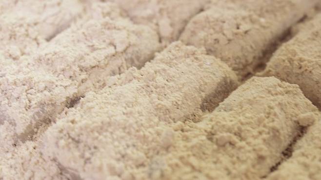 넓은 곳에서 콩고물을 펼쳐 놓은 후, 떡을 올려 널찍하게 펴주세요. 저는 조금 두툼한 두께로 펼쳐 주었답니다. 그리고 윗부분에 콩고물로 덮어 주면 거의 끝!
