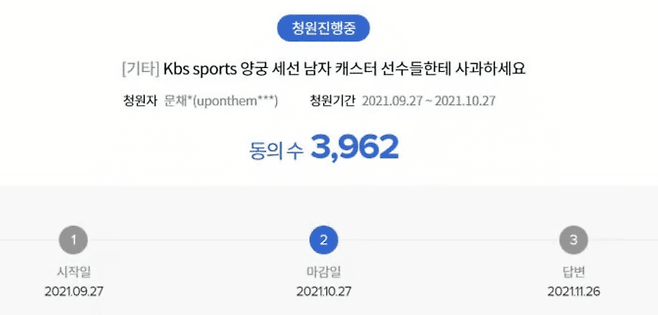 해당 방송 이후 KBS 시청자권익센터에는 'KBS sports 양궁 세계선수권 남자 캐스터 선수들에게 사과하세요'라는 청원이 게시되며 많은 이들의 시선을 사로잡았습니다.