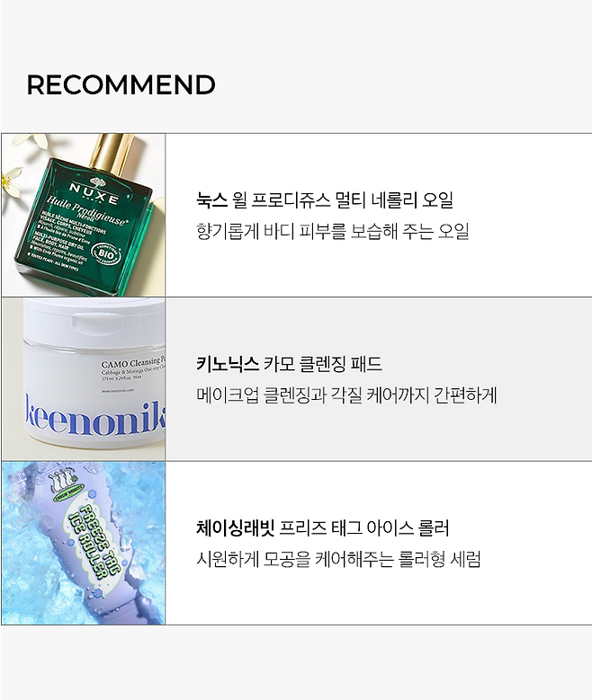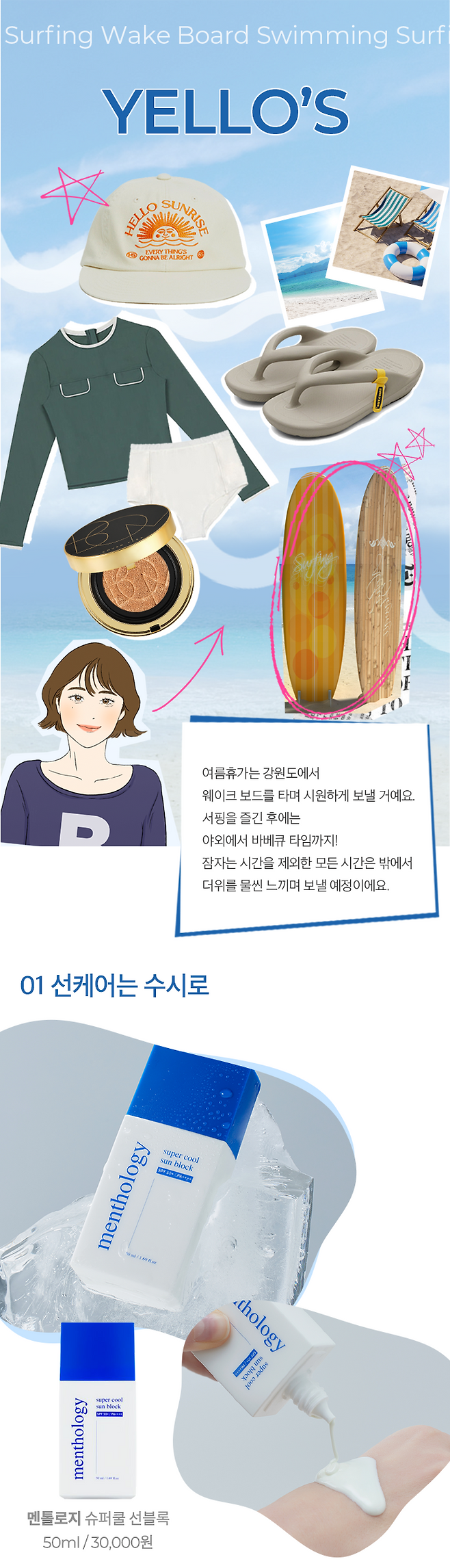 야외에서 긴 시간을 보내야 하기 때문에 선케어 제품은 필수로 준비해요. 멘톨로지 슈퍼쿨 선블록은 바르는 순간 즉각적인 쿨링감으로 피부 열을 낮춰주는 선케어 제품인데요. 자극 없이 순해서 데일리 선케어로도 손색이 없죠. 촉촉한 로션을 바른 것처럼 백탁 없이 자연스러운 발림성에 마무리감도 산뜻해서 야외 활동 중에 계속해서 덧발라주기 좋아요.