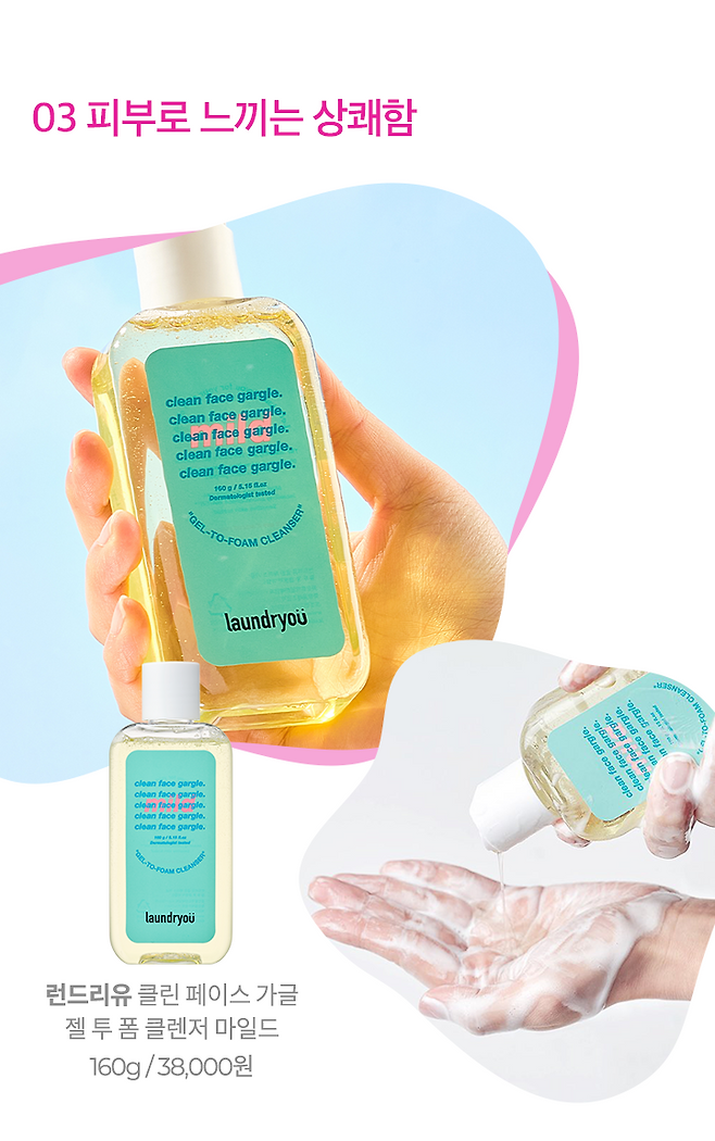 수영을 즐긴 후 달아오른 피부 온도를 낮춰 줄 런드리유의 페이스 가글 젤 투 폼 클렌저! 부드러운 거품으로 피부 노폐물을 딥 클렌징해주는데요. 덥고 습해진 날씨에 어떤 클렌징을 사용해도 피부가 답답하다고 느낄 때, 런드리유의 클렌징 젤 제품으로 클렌징해주면 마치 피부에 가글을 한 것 같은 시원한 청량감을 느낄 수 있어요. 아침 세안에 사용해 주어도 자극 없이 시원해서 더욱 상쾌한 아침을 시작할 수 있죠. 처음엔 피부에 느껴지는 청량함이 생소할 수 있지만, 어느새 상쾌함에 중독되어서 없으면 오히려 허전해질걸요?!(웃음)