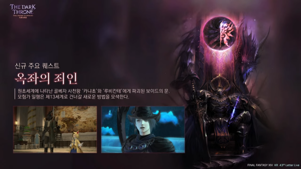 먼저 레터라이브에서는 서비스 8주년을 기념해 '빛의 모험가'의 이름으로 전달된 지파운데이션 기부금 전달 소식을 전했다. 또한 오는 10월 31일에 적용되는 V6.4 업데이트 옥좌의 죄인에 적용되는 신규 시나리오, 신규 인스턴스 던전, 신규 레이드 등 신규 콘텐츠를 대거 공개했다.
