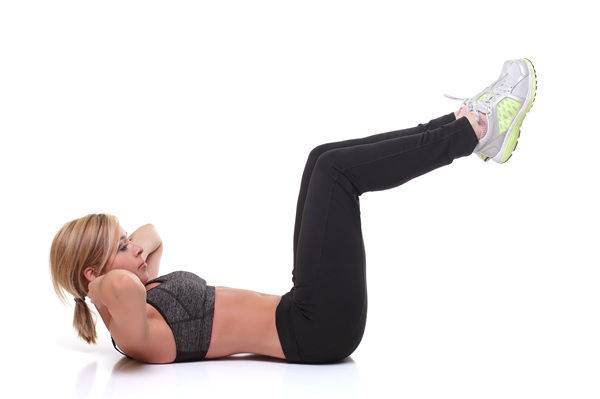 매트에 등을 대고 누운 상태에서 손은 머리 뒤로 가져가 가볍게 받칩니다. 다리는 공중에 들어 무릎을 90도 각도로 구부리고, 발은 서로 교차합니다. 복부에 힘을 주며 상체를 천천히 일으켰다가 다시 내려옵니다.