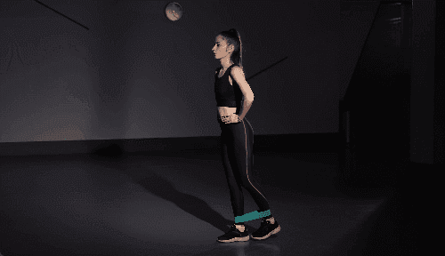 매트 위에 서서 두 발을 모은 상태로 서고, 손은 옆구리에 둡니다. 다리 사이에 밴드를 착용합니다. 왼쪽 다리를 뒤로 뻗으며 엉덩이에 힘을 주는 킥백 동작을 반복하세요. 오른쪽 다리로 동일하게 진행합니다.