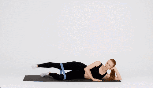 매트 위에 왼쪽 옆으로 누워 왼손으로 머리를 받치고, 오른손은 바닥에 짚어 균형을 잡습니다. 오른쪽 다리를 천천히 공중으로 들어 올렸다가 다시 내리는 동작을 반복합니다. 이후 자세를 바꿔 오른쪽으로 누워 왼쪽 다리를 같은 방식으로 들어 올립니다.