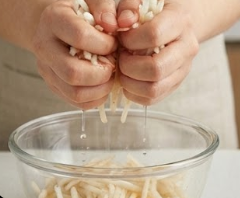 ▶ 체에 받쳐 물기 뺀 뒤 손으로 꽉 짜줍니다
