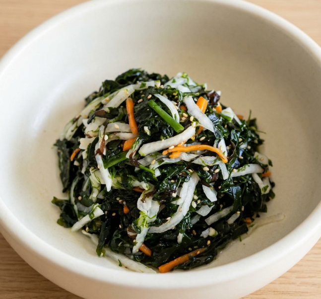 ▶ 파래 2~3덩이▶ 무 1/4개▶ 설탕 1큰술▶ 소금 1작은술▶ 식초 2큰술▶ 다진 마늘 1/2큰술▶ 참기름 1큰술▶ 통깨 약간