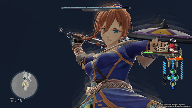 초반부터 히로인 ‘카자’와 콤보를 맺게 되는데, 이번 작품의 특징인 콤보 액션을 맛볼 수 있습니다. 콤보 액션을 통해 더 강하고 다양한 공격과 방어가 가능하기 때문에 지금까지 시리즈 중 가장 손이 바쁜 느낌입니다. 캐릭터 개인이 쓰는 스킬이나 회피도 사용하면서 특정 버튼을 통해 콤보 스킬을 쓰거나 큰 기술을 방어해야 하기 때문입니다. 이스이니만큼 속도가 상당히 빠르기 때문에 손이 빠르지 못한 기자는 보스전마다 게임 오버를 목격하기도 했습니다. ‘적의 힘을 낮추어 재도전’, 있습니다….