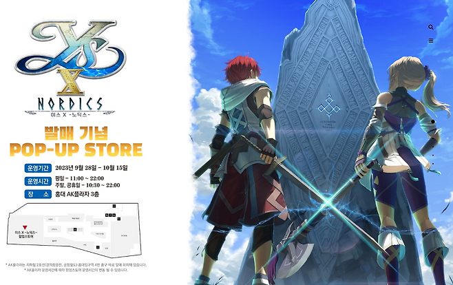 이스 X 발매 기념으로 28일부터 10월 15일까지 홍대AK플라자 3층에서 팝업 스토어가 오픈합니다. 팝업 스토어에서는 국내 제작 굿즈 및 니혼 팔콤 공식 라이센스 굿즈를 구매할 수도 있고, 판매를 개시한 이스 X 타이틀을 시연해볼 수도 있습니다. 또한 캐릭터 타투 프린팅 인증샷 이벤트에 참여하거나 CLE, 니혼 팔콤, 팝업 스토어 등에 바라는 점을 적을 수 있는 앙케이트도 작성할 수 있습니다. 굿즈는 이번 작품 굿즈 외에도 ‘궤적’ 시리즈나 여타 이스 시리즈 굿즈도 판매하니 니혼 팔콤 게임의 팬이라면 필수 방문해야 할 것 같네요.