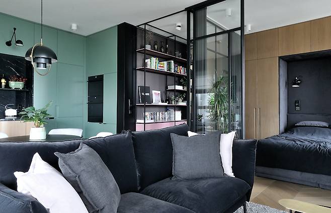 특히 책장 프레임이나 유리 파티션은 단단한 선을 강조하는 동시에, 빛을 흡수하고 반사하는 방식으로 섬세하게 다뤘다. 덕분에 이 집의 거실은 어두운 색상임에도 불구하고 시각적으로 깊이 있고 감도 있는 공간이 되었다.