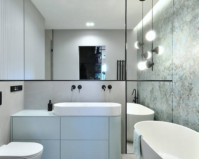 블랙과 파스텔, 그리고 민트의 조화는 깔끔하지만 단조롭지 않다. 창문을 작게 내고, 내부 조명을 전략적으로 설치함으로써 조명 하나하나가 물리적인 가구 역할을 해낸다.
