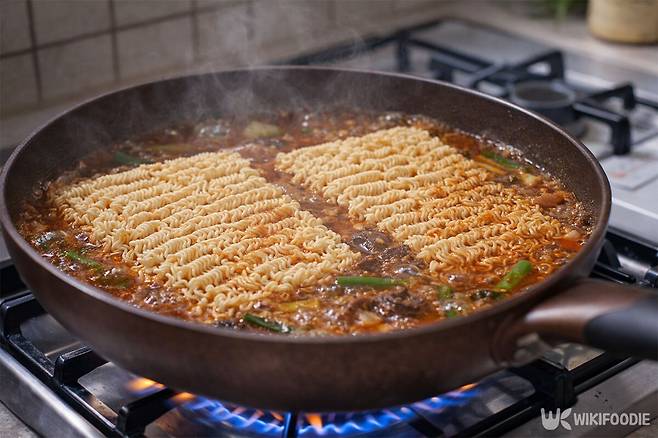 물이 끓어오르면 라면 면 2개와 스프 1개를 넣는다. 스프를 1개만 넣는 이유는 앞서 간장으로 기본 간을 맞췄기 때문이다. 스프 양을 줄여야 국물이 짜지 않고 맛이 깔끔하다. 면은 너무 오래 끓이지 않고 적당히 익혀야 꼬들꼬들한 식감을 즐길 수 있다.