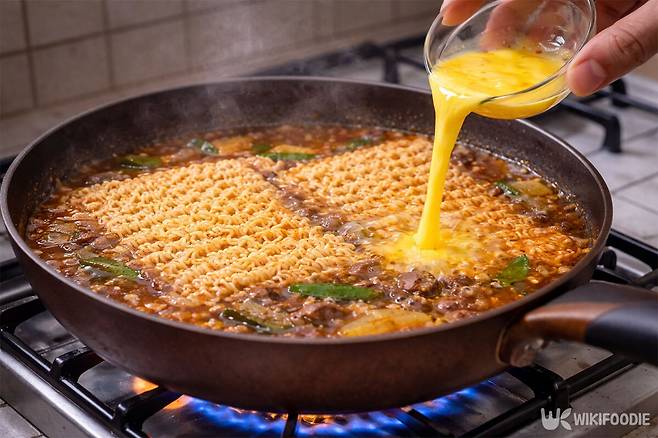 마지막으로 미리 풀어둔 계란 2개를 국물에 천천히 붓는다. 불을 줄인 상태에서 원을 그리듯 부어야 국물이 탁해지지 않고 계란이 구름처럼 부드럽게 퍼진다. 라면에 들어있는 후레이크를 뿌려 마무리하면 완성이다.