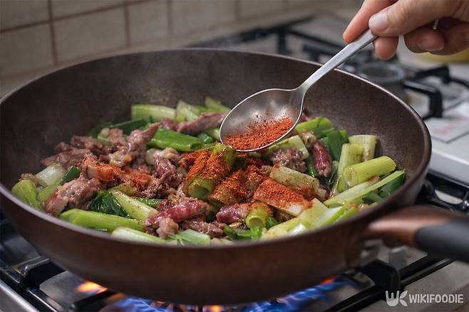고기가 어느 정도 익으면 양조간장 1큰술과 국간장 1큰술을 넣는다. 간장이 타듯 끓으며 고기에 간이 배면 감칠맛이 깊어진다. 국간장이 없다면 멸치액젓을 써도 맛이 잘 어우러진다. 그다음 고춧가루 3큰술을 넣고 약한 불에서 볶아 고추기름을 만든다.