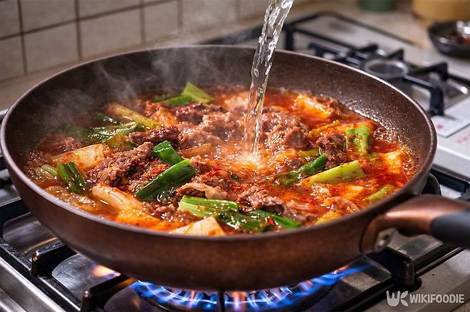 이때 불이 너무 세면 고춧가루가 타서 쓴맛이 날 수 있으니 주의한다. 매콤한 향이 올라오면 물 1.1L를 붓고 한 차례 강하게 끓여 국물 맛을 정리한다.