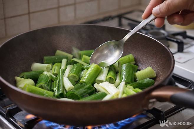 먼저 대파 15cm 길이 4개를 세로로 길게 자른 뒤 2~3cm 간격으로 썬다. 이렇게 손질하면 볶을 때 파 향이 더 잘 올라오고 씹는 맛도 좋아진다. 냄비에 식용유를 넉넉히 두르고 대파를 넣어 충분히 볶는다.