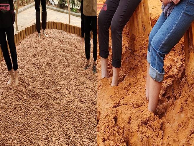 이 황토볼장은 황토를 작게 구슬처럼 만든 볼 위를 걷는 체험 공간으로, 혈액순환 개선과 피로 완화에 도움을 준다.