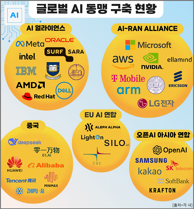 최근 중국 저가형 인공지능(AI) 딥시크 등장을 기점으로 글로벌 빅테크 기업들이 AI 동맹 구축에 속도를 내기 시작했다. 동맹 구축을 통한 기술 경쟁력 확보로 글로벌 AI 시장의 선도 세력으로 자리매김하겠다는 의도로 해석된다. 현재 두각을 드러내고 있는 글로벌 AI 동맹 세력으로는 △메타와 IBM이 주도하고 있는 AI 얼라이언스 △마이크로소프트의 AI-RAN 얼라이언스 △중국 정부로부터 탄탄한 지원을 받는 중국 AI 기업들 △유럽 국가 기업들이 뭉친 EU AI 연합 △오픈AI가 구축하려는 한·미·일 AI 동맹 등이 있다.