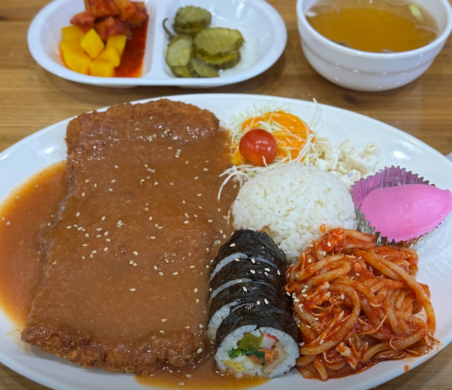 커다란 돈까스 한 장에김밥 여러 줄, 쫄면까지 한 접시 가득.