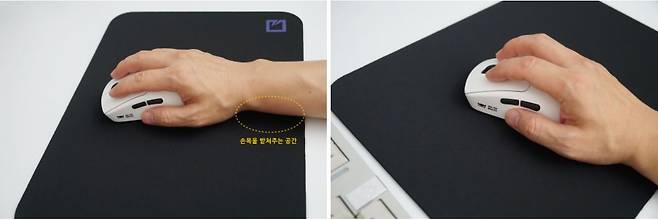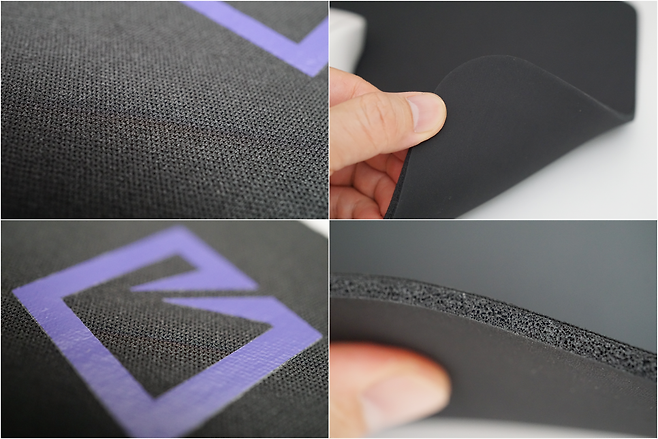 ○ 측면 : 위아래 패드를 단단하게 붙여 마우스가 패드의 경계면으로 가더라도 걸림이 없어 박음질로 인한 움직임의 제약, 피부 쓸림 등을 방지하고 있습니다.