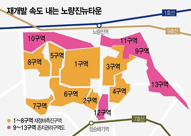 노량진·대방동 일대 73만8000㎡ 규모 노량진뉴타운은 2003년 서울시 2차 뉴타운지구로 지정됐다. 2009년 6개 구역으로 나뉘어 지정됐고 이듬해 대방동 일대 1000㎡가 7~8구역으로 추가 지정됐다. 이때만 해도 노량진 일대는 인근에 대규모 아파트가 없고 낙후된 이미지 탓에 광화문, 종로, 여의도, 강남 등 서울 내 업무지구와 가깝다는 장점에도 불구하고 저평가돼왔다. 노량진수산물시장, 학원가 등을 중심으로 복잡한 토지 이해관계가 얽히고설키면서 개발 사업이 좀처럼 속도를 못 냈다. 2003년 처음 뉴타운으로 지정된 이후 아직까지 사업이 완료된 곳이 없는 배경이다.