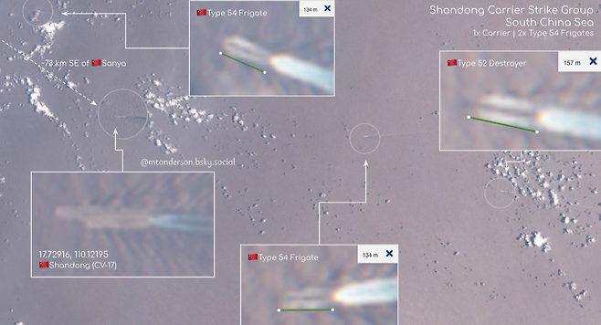 센티넬 2 위성이 촬영한 바에 의하면 4월 28일 오후 3시쯤 산둥 항모 전단은 원래 있던 해역에서 벗어나 하이난다오 산야 해군 기지 78km 지점에서 발견되었습니다.