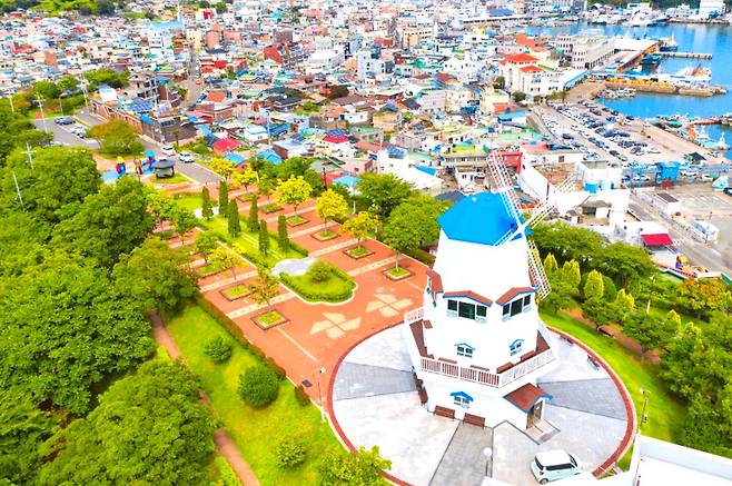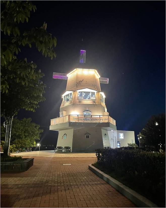 청널공원의 중심에는 눈처럼 새하얀 풍차가 우뚝 서 있습니다. 그냥 조형물인 줄 알았다가 가까이 다가가면, 문이 열려 있다는 걸 알게 되죠. 계단을 따라 꼭대기까지 오르면 삼천포항과 방파제가 한눈에 내려다보이는 전망이 펼쳐집니다.