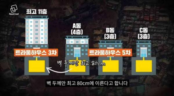 3차에는 지하 3층에 벙커가 설치됐는데, 면적이 84㎡에 불과하다. 5차에는 각 동의 지하 4층에 벙커가 있다. A동(8세대) 225.95㎡, B동(6세대) 161.45㎡, C동(4세대) 112.9㎡ 규모다. 여기에 주민공동시설, 대피로 등이 있어 비상 상황에서 생활하기에 충분한 공간이다.