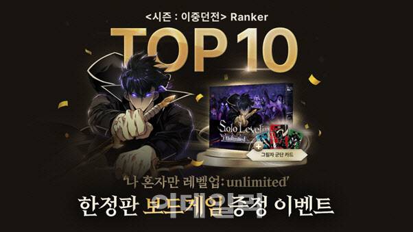 시즌 ‘이중 던전’의 메인 이벤트는 랭킹 상위 10명에게 제공되는 ‘쉐도우 아미 NFT 컬렉션’이 포함된 ‘나 혼자만 레벨업: 언리미티드 보드게임’ 증정 이벤트다. 특히, 공정성과 투명성이 보장되는 블록체인 기반으로 설계된 Collect to Earn(C2E) 시스템의 신뢰를 바탕으로 디지털 NFT와 실물 기념품 카드를 동시에 소장할 수 있는 이번 시즌 이벤트에 대한 팬들의 관심이 집중되고 있다.