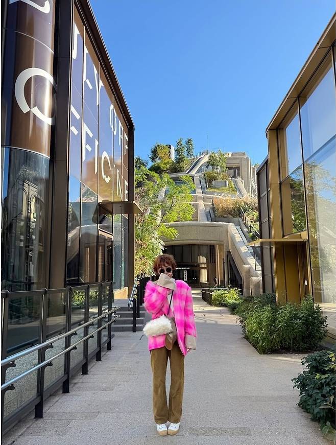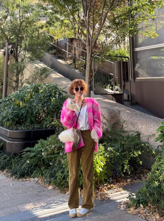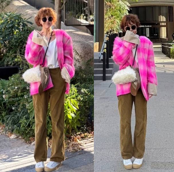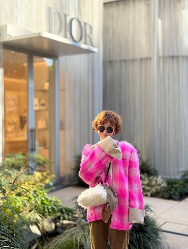 과감한 핫 핑크 재킷과 카키색 팬츠를 매치하며 트렌디하면서도 개성 넘치는 스타일링을 선보였습니다.