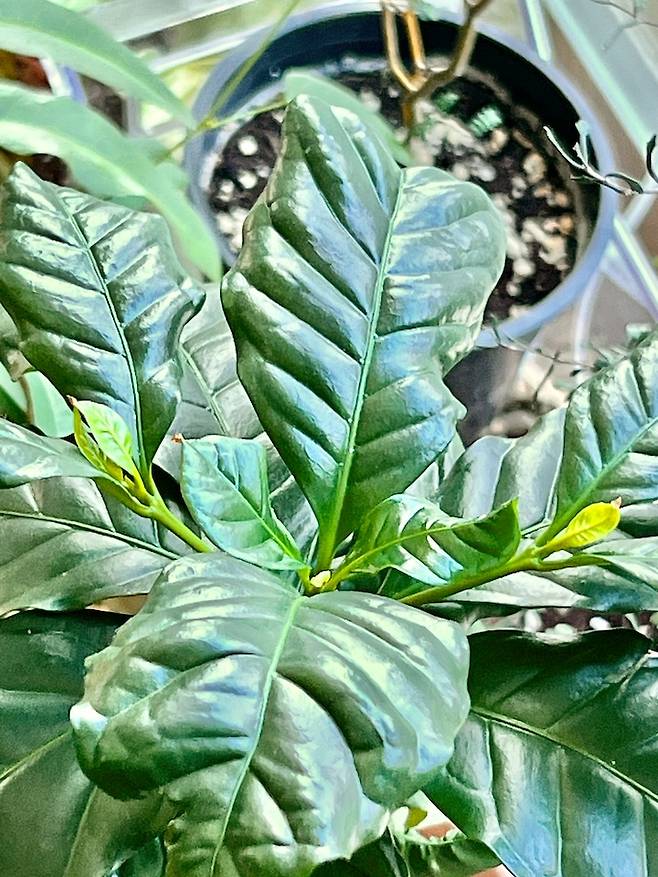 아무런 정보 없이 식물킬러 시절부터 길러왔던 이 커피나무는 항상 그늘진 곳에서 적응하며 잘 지내주어서 알아보지도 않고 당연히 반음지 식물 정도로 여겼던 저는 충격을 받았습니다.