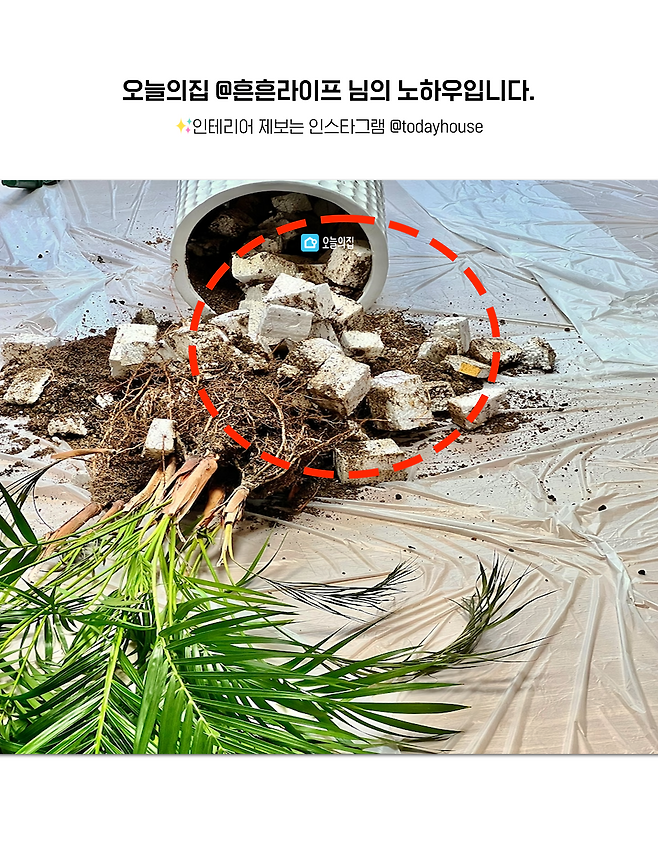 그러던 어느 날 물을 주다가 흙에서 무언가를 발견했어요. 바로 스티로폼이었습니다! 대품 아레카야자 화분 속에는 흙 대신 가벼운 스티로폼이 잔뜩 채워져 있었던 것이었어요.