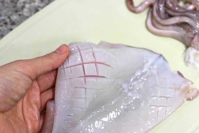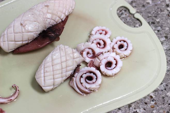 저는 채소가 없어서 그냥 이대로 썰었어요. 그래도 충분히 그럴듯하지요! 칼집 없이 데쳐도 맛에는 큰 차이는 없지만 칼집 넣고 데치면 모양도 예쁘고 식감도 좋아진답니다. 오징어 데치는 시간은 물 양, 불의 세기에 따라 조금씩 달라질 수 있으니 맛있게 만들어보세요.