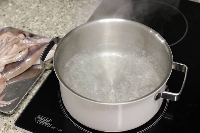 오징어 데치는 시간은 색깔과 물이 끓는 모양으로 판단하면 돼요. 팔팔 끓던 물도 오징어가 들어가면 확 식는데 다시 팔팔 끓어 오를 때까지 데치면 됩니다.