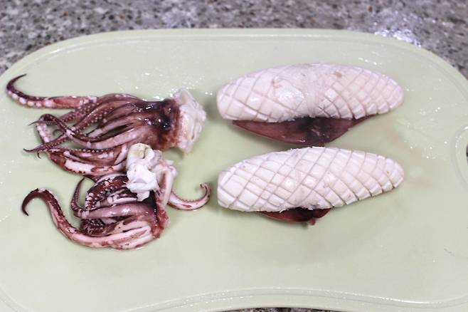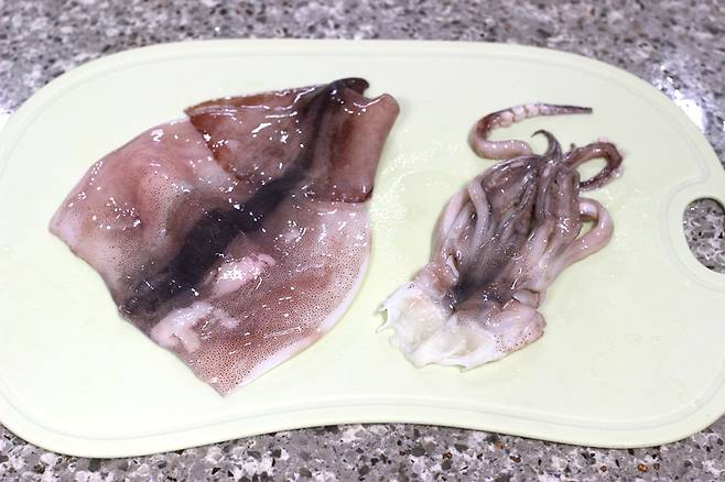손질된 오징어를 2마리 준비했어요. 만약 손질이 안 된 상태라면 몸통을 반으로 갈라 내장을 제거하고 다리 가운데 입을 빼면 돼요.