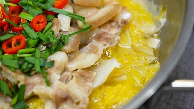 홍고추와 부추는 송송 썬다. 큰 냄비에 알배추를 깔고, 그 위에 얇은 삼겹살을 올린다. 삼겹살 위에 편마늘을 올리고, 소금 1t, 후추 1t, 설탕 1t, 참치액 1T를 넣는다.