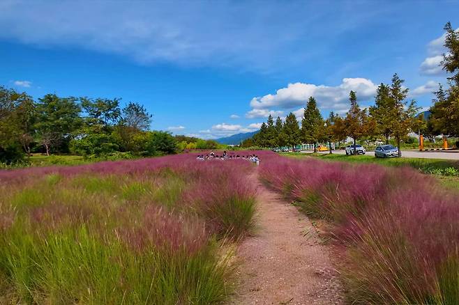 넓게 펼쳐진 핑크뮬리 군락과 함께 공원 주변을 산책하며 자연을 만끽할 수 있으며, 강변을 따라 이어지는 산책로가 이곳의 가을을 더욱 특별하게 만들어 줍니다.