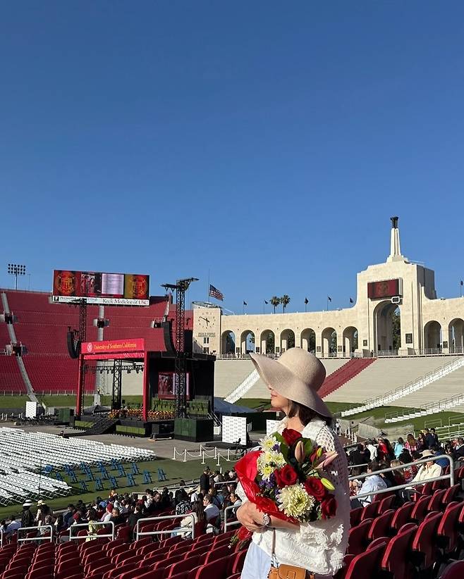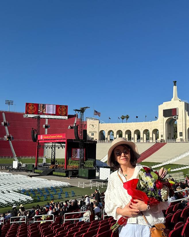 햇살 가득한 USC 캠퍼스와 경기장 앞에서 꽃다발을 든 모습은 마치 한 편의 다큐멘터리 한 장면처럼 따뜻하고 벅찬 분위기를 전한다.