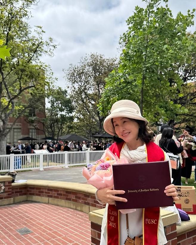 나이를 잊게 하는 단정한 스타일과 자연스러운 미소는 많은 이들의 시선을 사로잡았다. ‘CLASS OF 2025’ 문구가 새겨진 붉은 스톨은 그녀의 새로운 출발을 암시하는 듯한 상징적 포인트가 되었다.