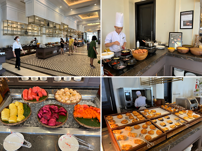 쉐라톤 푸꾸옥 롱 비치 리조트에 머물며 가장 많이 방문한 레스토랑은 프라임 바 앤 그릴(Prime Bar & Grill)이다. 큰 창으로 리조트 앞바다를 한눈에 담을 수 있는 이곳은 조식부터 석식까지, 매 끼니를 해결할 수 있는 장소다. 조식은 뷔페식으로 베트남 현지 음식은 물론 아시아, 서양식까지 다양한 음식이 준비된다. 어린이들을 위해 캐릭터 모양으로 팬케이크를 구워주는 서비스도 있었다. 다만 동남아시아를 여행하며 기대했던 점 중 하나인 열대 과일은 생각보다 부실하게 준비돼있었다. 파인애플이나 수박도 좋지만 망고와 패션후르츠와 같이 동남아시아만의 특색있는 과일을 제공했다면 더 좋았을 것 같아 조금 아쉬웠다.