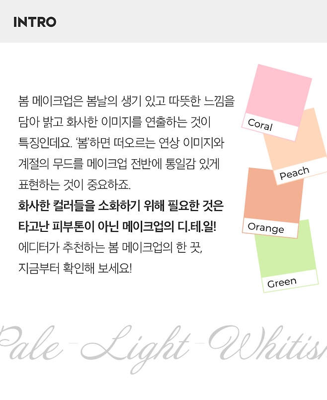 봄 컬러만 쓰면 동동 뜨는 피부 톤이라구요? 화창한 봄날씨에 모처럼 생기 있고 화사한 메이크업을 시도하고 싶지만, 톤그로 걱정에 망설이고 있다면!? 타고난 23호 가을 웜톤 에디터가 ‘너 봄웜이지’ 소리 듣는 메이크업 방법을 참고해 볼 것! 피부톤 구애 없이 화사하면서도 여리한 봄 메이크업을 완성하는 꿀팁을 모아봤어요. 더 자세한 내용이 궁금하다면 글로우픽 캐스트를 통해 전문을 확인해 보세요!