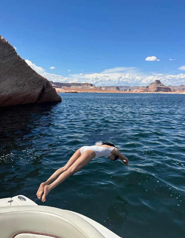 제니는 헤어를 올려묶고 디테일없이 깔끔한 화이트 원피스 수영복으로 눈길을 끌었다.
