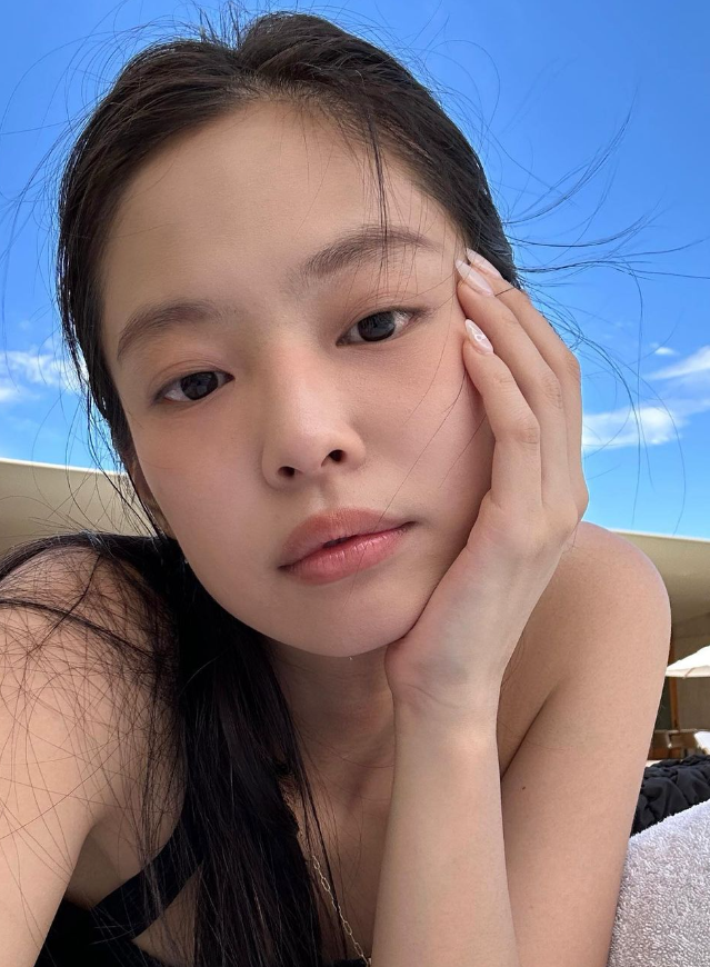 제니는 초호화 리조트에서 수영을 즐기는 모습도 선보였다. 제니는 화장기 없는 얼굴에 블랙 의상으로 시크하고 모던한 바캉스룩을 선보였다.