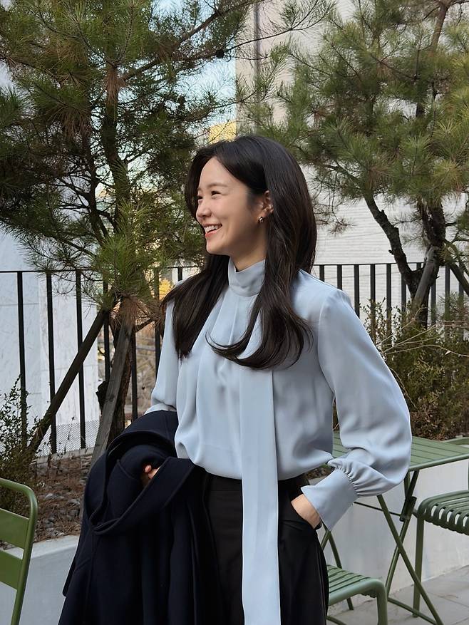 그녀의 선택은 은은한 스카이 블루 컬러의 하이넥 타이드 블라우스와 깔끔한 블랙 와이드 팬츠였죠.